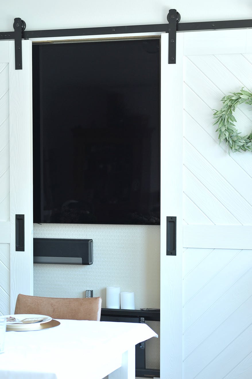 Mögen Sie einfache Innenräume, in denen Gemütlichkeit herrscht, aber Sie können sich einen Samstagabend ohne Ihre Lieblingssendung von Netflix nicht vorstellen? Kein Problem. Doppelschiebetüren im Wohnzimmer eignen sich hervorragend, um den Fernseher zu verstecken und einen geschlossenen Raum für ein Heimkino zu schaffen, während alle Funktionen des Fernsehers erhalten bleiben. Wie auch immer, sieht selbst.
