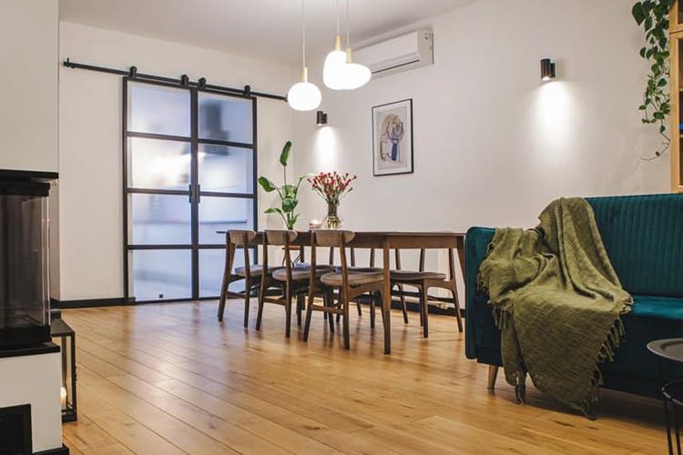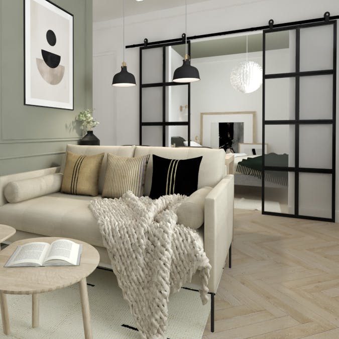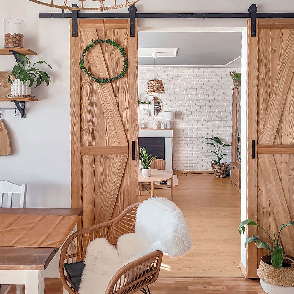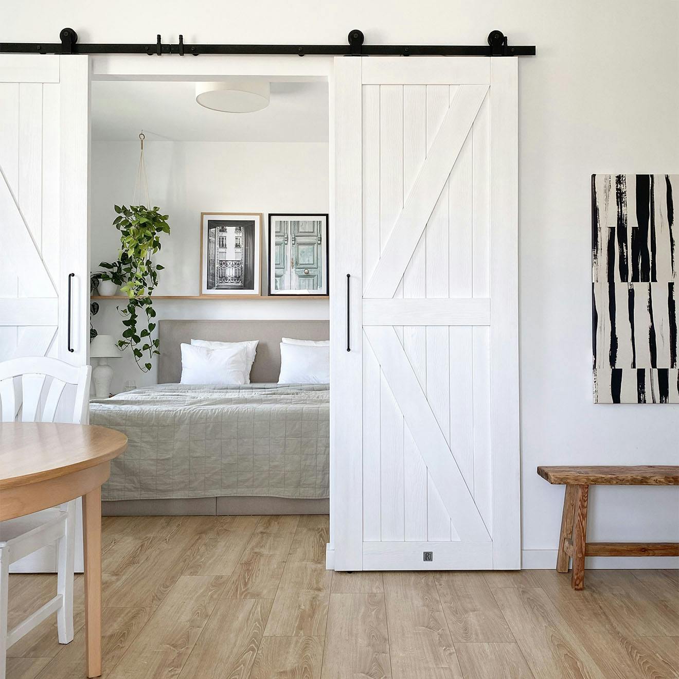 Obwohl es den Anschein haben mag, dass Doppeltüren besser für größere Innenräume geeignet sind, ist diese Lösung in kleinen Räumen auch vollkommen in Ordnung! Aufgrund ihrer praktischen Verwendung eignen sie sich am besten zwischen Wohn- und Schlafzimmer. Außerdem tun sie genau das, was Schiebetüren tun sollen: Charakter verleihen!