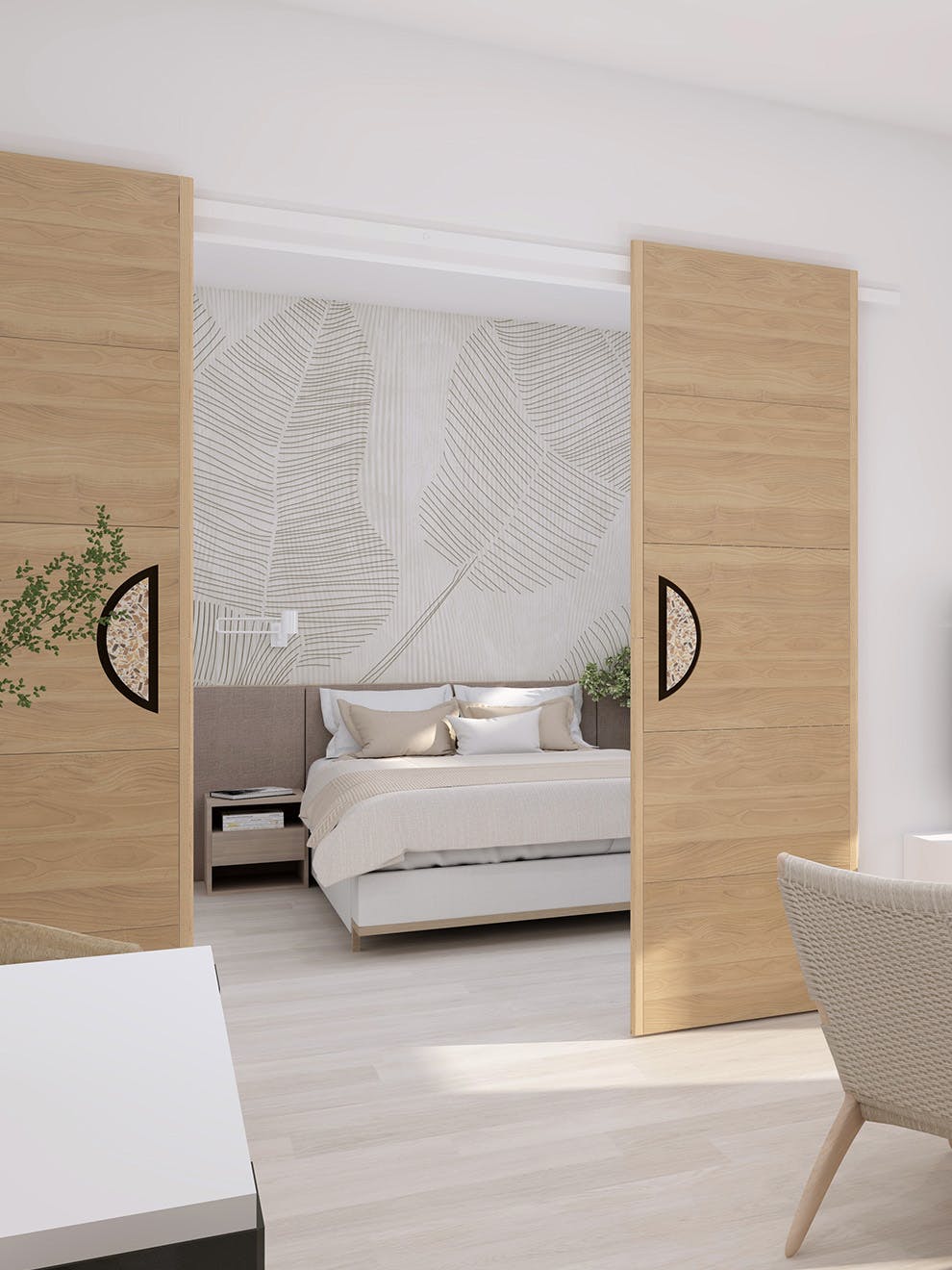 Es war mir wichtig, unter anderem auf den Moment des Wechsels von einem Raum in einen anderen zu achten, daher das Detail der abgerundeten Kante der Tür. Der runde Griff kann dank der Vielfalt möglicher Oberflächen eine angenehme Dominante im Innenraum sein. Als Material, aus dem es hergestellt wird, schlug ich die Verwendung von Foresso vor - Material aus Holzabfällen. Meiner Meinung nach verändert eine solche Verwendung dieser Art von Material seine Wahrnehmung durch ein breiteres Publikum. Die Verzierung der Foresso-Textur ist auf intelligente Weise nicht offensichtlich und dekorativ.