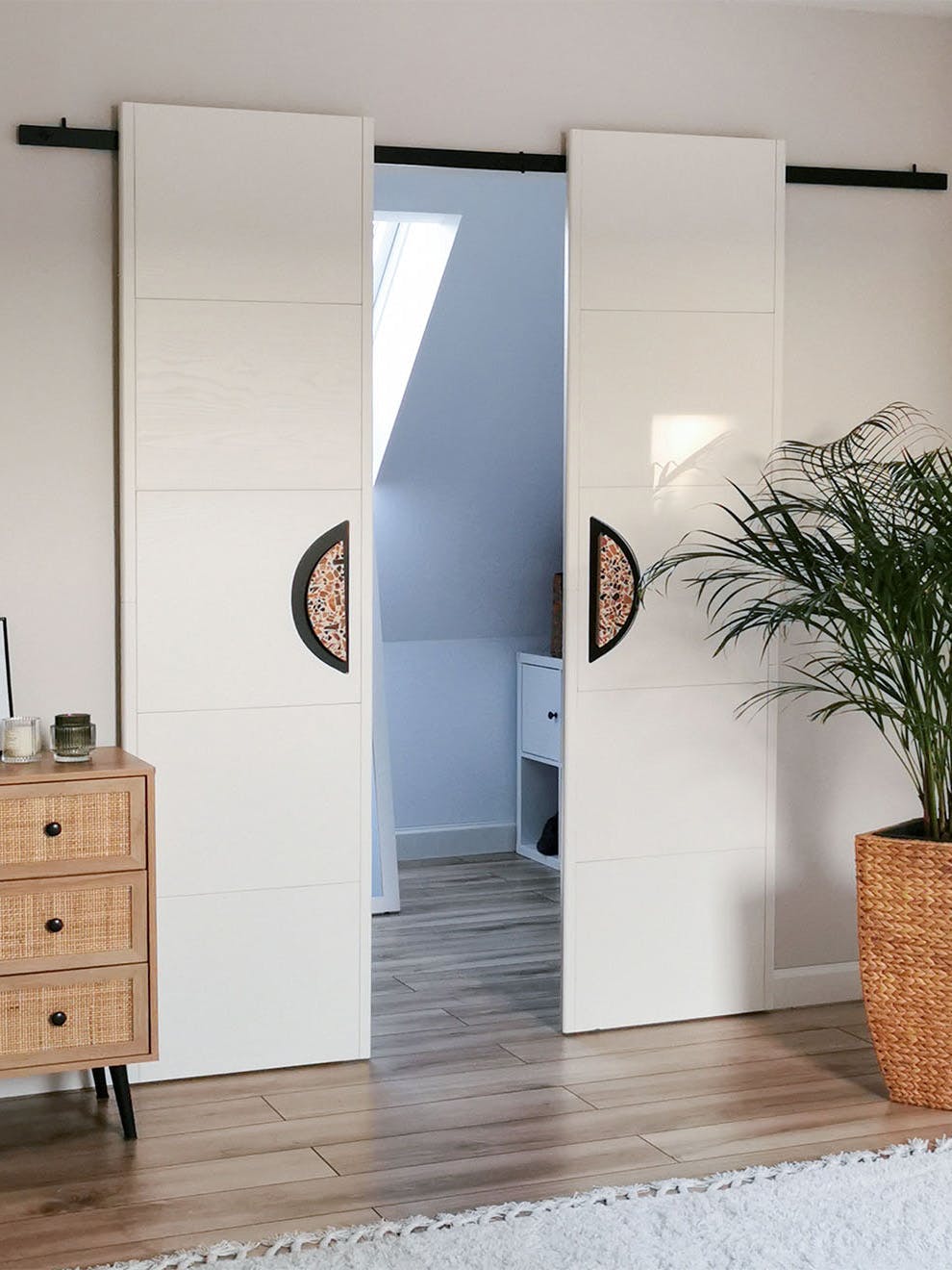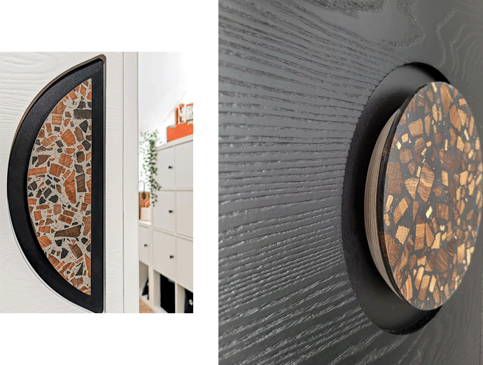 Nicht nur das Design selbst ist wichtig, sondern auch, wie der gesamte Prozess funktioniert. Wir verpacken die Türen in flachen Paketen, weil wir den Kohlendioxidausstoß reduzieren wollen, und wir verwenden nur natürliche Materialien in der Produktion. Der große Griff, den Sie an der Tür sehen, wurde aus in Epoxidharz getauchten Holzabfällen hergestellt (ja, es sieht aus wie modischer Terrazzo!), wodurch wir die Idee von weniger Abfall mit modernem Design kombiniert haben.