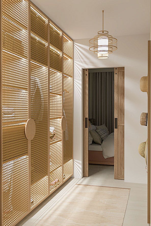 Und da Sie nun wissen, warum es sich lohnt, dem Interieur mithilfe von Rattan ein wenig Magie zu verleihen, zeigen wir Ihnen einige interessante Inspirationen. Die Hauptelemente werden Rattanstühle, Kommoden, Paravents und … Türen sein. Richtig, Rattan-Schiebetüren sind eine fantastische Idee, um dem Innenraum Charakter zu verleihen.