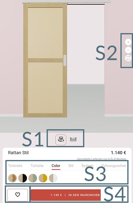 4. Die Elemente, die Sie bearbeiten können, variieren je nach gewähltem Modell (Sektion S3). Bei Rattan-Türen sind dies: