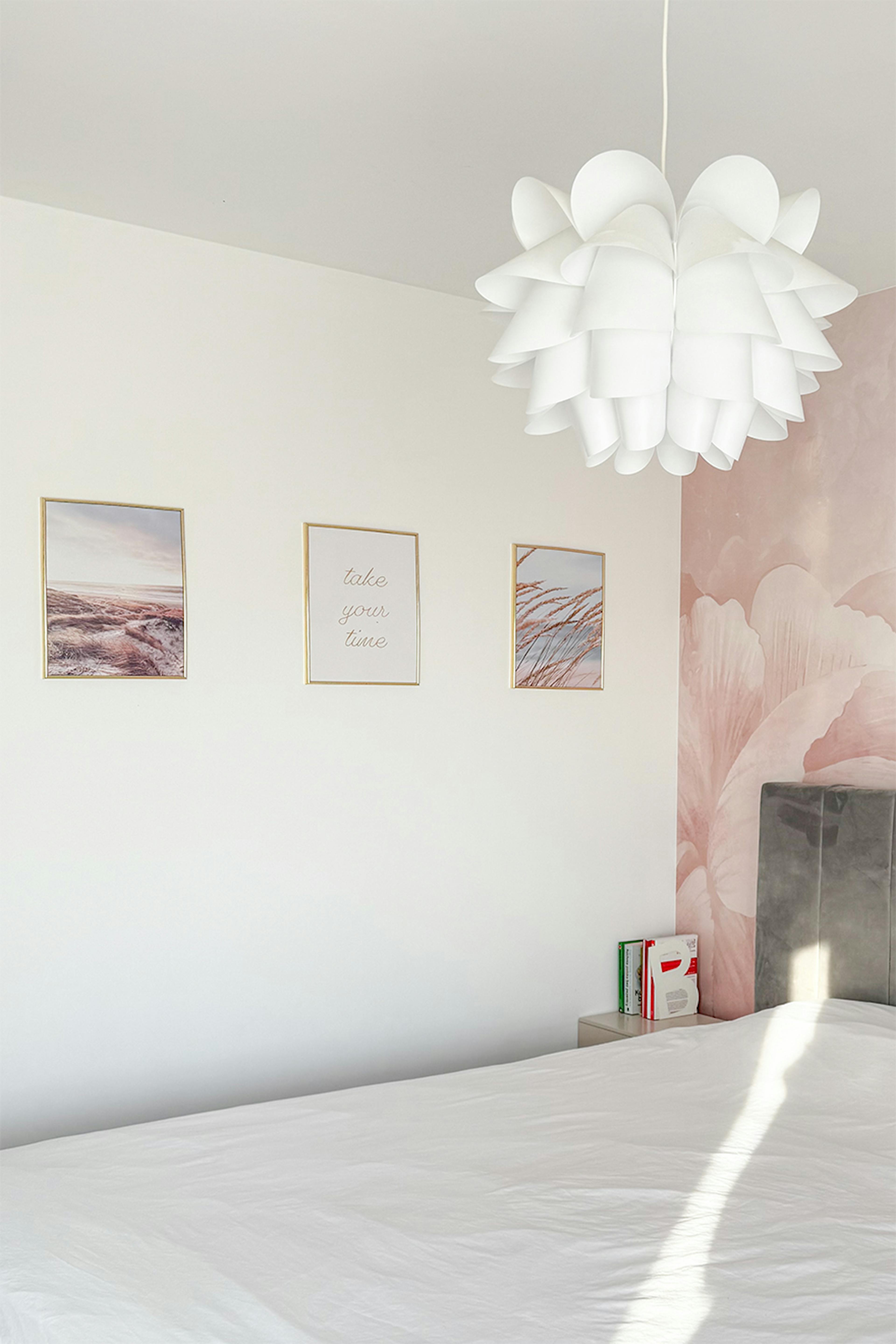 Das Herzstück des Schlafzimmers ist ein bequemes Bett mit einem grauen, gesteppten Kopfteil. Seine gedeckte Farbe bildet einen angenehmen Kontrast zu den hellen, rosa Accessoires. Die Wand hinter dem Kopfteil ziert eine großformatige Fototapete mit Blumenmotiv, die dem Raum Weichheit verleiht. An der gegenüberliegenden Wand erzeugen dünne Linien in Goldfarbe ein dynamisches, geometrisches Muster, das dem Interieur Dynamik und Tiefe schenkt.