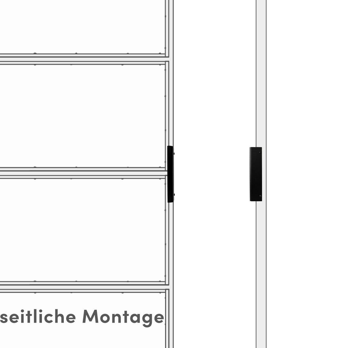 Es kann flach auf der Türoberfläche oder an der Seitenkante der Tür montiert werden. Eine flache Montage an der Vorderseite der Tür wird empfohlen. Die Montage auf der Rückseite der Tür ist nur möglich, wenn der Abstand von der Tür zur Wand mindestens 2 cm beträgt.